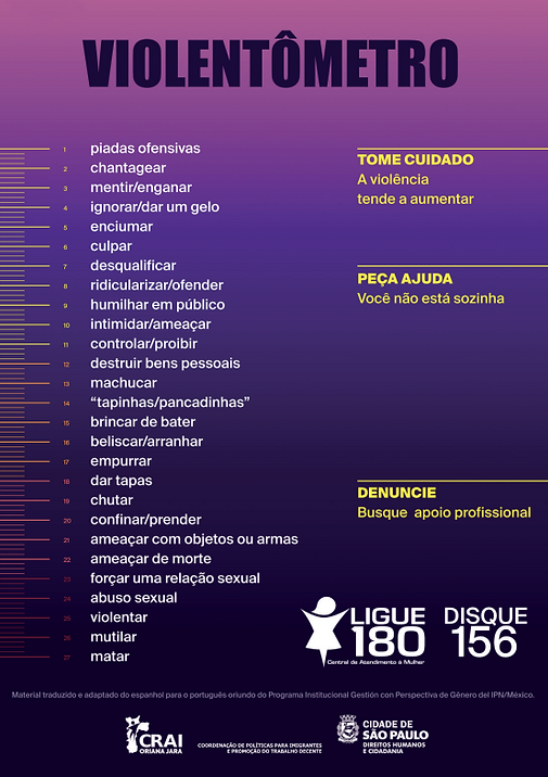 O violentômetro é uma ferramenta que ajuda a identificar e compreender os diferentes níveis de violência em um relacionamento. Muitas vezes, comportamentos abusivos começam de forma sutil e vão se intensificando com o tempo. Por isso, reconhecer os sinais desde o início é essencial. Esta escala mostra, de forma progressiva, atitudes que vão desde agressões verbais e emocionais até formas mais graves de violência física e risco de morte. Ao conhecer esses sinais, você pode se proteger, buscar ajuda e também apoiar outras mulheres.